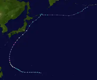 At 06:00 UTC on June 26, the JMA estimated Kit's pressure to have abruptly dropped to 880 mbar (hPa; 25.99 inHg),[2] which would rank it among the top ten most intense tropical cyclones on record.[4] Around this time, the JTWC estimated Kit to have attained peak winds of 315 km/h (196 mph);[3][5] however, these winds are likely an overestimate.[6] A later reconnaissance mission on June 26 reported a pressure of 912 mbar (hPa; 26.93 inHg), the lowest observed in relation to the typhoon.[1] Weakening ensued thereafter as the system accelerated to the north-northeast. Retaining typhoon strength, Kit brushed southeastern Honshu, Japan, on June 28, passing roughly 155 km (96 mi) east of Tokyo. The system subsequently weakened to a tropical storm and transitioned into an extratropical cyclone south of Hokkaido on June 29.[3] The National Oceanic and Atmospheric Administration reported the remnants of Kit to have dissipated the following day near northeastern Hokkaido.[7] However, the JMA states that the system turned eastward and accelerated over the north Pacific before losing its identity on July 3 near the International Dateline.[2]