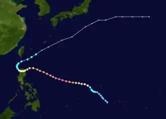 Soon after, on 12:00 UTC on October 27, Ruth made landfall in northern Luzon with 1-minute sustained winds of 185 km/h (115 mph) and 10-minute sustained winds of 155 km/h (100 mph),[4] making it the strongest typhoon to strike the region that year.[2] A deeper mid-tropospheric trough picked up Ruth, making it recurve south of Taiwan.[2] As this occurred, Ruth exited the PAR on October 30, causing PAGASA to stop tracking it.[1] Significant weakening occurred as the Ruth tracked northeastward,[2] causing both the JTWC and JMA to last monitor Ruth on 00:00 UTC the next day.[3][2] Transitioning into an extratropical low soon after,[3] the remnants of Ruth interacted with a frontal low prior to dissipating on November 3.[5][3]
