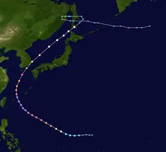 About three hours after Sarah reached peak winds, the typhoon moved directly over Miyako-jima, an island of Japan east of Taiwan. Sarah weakened while curving to the north, and it passed west of Okinawa late on September 15.[1] The winds dropped quickly; by 24 hours after peak intensity, Sarah's winds had decreased from 305 to 185 km/h (190 to 115 mph). The typhoon turned and accelerated to the northeast toward the Korean peninsula, re-intensifying slightly. By late on September 16, the winds increased to 215 km/h (135 mph) while Sarah passed just east of Jeju island. The typhoon weakened again to winds of 185 km/h (115 mph) by 00:00 UTC on September 17.[1] That day, Sarah made landfall a few miles west of Busan, South Korea at that intensity;[1][3] this made Sarah the strongest typhoon to strike the country since records began in 1904, and it remained as such until Typhoon Maemi surpassed it in 2003.[3] The typhoon very quickly emerged into the Sea of Japan, its circulation becoming poorly defined. On September 18, Sarah became extratropical after moving over the northern Japanese island of Hokkaido.[1] The remnants continued to the northeast initially before turning sharply westward, passing over Sakhalin. The circulation progressed into Primorsky Krai in the Russian Far East before turning back east. Former Typhoon Sarah struck Sakhalin a second time on September 20 while moving east-southeastward. After passing through the Kuril Islands, the remnants of Sarah dissipated on September 23.[2]