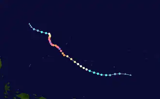Typhoon Wutip, known in the Philippines as Tropical Depression Betty, was the most powerful February typhoon on record, surpassing Typhoon Higos of 2015.[1] The third tropical cyclone, second tropical storm, and the first typhoon of the 2019 Pacific typhoon season, Wutip originated from a low-pressure area on February 16, 2019, that generally tracked westward, passing just south of the Federated States of Micronesia (FSM), before organizing into a tropical depression on February 18. The depression was later classified a tropical storm a day later, attaining the name Wutip from the Japan Meteorological Agency. The storm gradually intensified as it turned northwest, before it underwent rapid intensification on February 23, while passing to the southwest of Guam, and reached its first peak intensity. With winds of 270 km/h (165 mph) estimated by the Joint Typhoon Warning Center, Wutip became the first Category 5-equivalent super typhoon on record in the month of February. Wutip underwent an eyewall replacement cycle shortly afterward and weakened. The storm finished its cycle on February 24, rapidly intensifying once again. Wutip reached a secondary peak intensity the following day, again attaining Category 5-equivalent winds. Thereafter, Wutip rapidly weakened for the rest of its lifespan from strong vertical wind shear, before dissipating over the Philippine Sea on March 2.