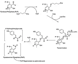 Each side of the dimer protein includes pyridoxal phosphate (PLP) bonded to the Lys280 residue of the tyrosine aminotransferase molecule. The amine group of tyrosine attacks the alpha carbon of the imine bonded to Lys280, forming a tetrahedral complex and then kicking off the LYS-ENZ. This process is known as transimination by the act of switching out the imine group bonded to PLP. The newly formed PLP-TYR molecule is then attacked by a base.