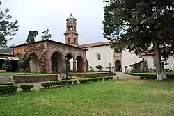 The main attraction of the modern town is the former monastery complex of San Francisco, which was founded in the 16th century.[9] The complex was designed and initiated in 1530 by Spanish architect (and Franciscan friar) Fray Pedro de Pila.[10] The complex contains the Church of San Francisco, the Church of La Soledad, two open chapels and a large atrium,[9] with much of the building material obtained from the nearby yacata pyramids that the Spanish destroyed.[11] The Church of San Francisco is the first built and still conserves the arch that separates the presbytery from the nave, which was the original portal of the 16th century. Next to this portal is a small open chapel from the same time period. There is a plaque on this open chapel that states that it stands on the site of the first Mass to be celebrated in Michoacán.[9] Inside the Church of La Soledad is the "Santo Entierro", which is a wax figure of Christ displayed in a glass coffin. It is believed (by Mexican folklore) that the arms and legs of this statue are growing. One end of the coffin has an extension added for the feet, with the toes reaching the glass end. Inside the coffin are U.S. and Mexican currency.[12][13]