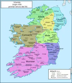 The Uí Liatháin are known from both Irish and British sources, respectively the Sanas Cormaic[4][5] and Historia Brittonum,[6] to have had colonies in Wales and Cornwall. According to the Historia Brittonum they were driven out of North Wales by Cunedda and his sons, and possibly have settled in South Wales such as the kingdoms of Dyfed, Ystrad Tywi, and Brycheiniog since they weren’t driven out from there.[7]