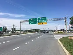Construction on an interchange with the Delaware Memorial Bridge approach at Farnhurst began on July 12, 1950.[61] On August 16, 1951, the Delaware Memorial Bridge opened to traffic.[62] US 40 was rerouted to use the new Delaware Memorial Bridge to cross the Delaware River, being realigned to follow US 13 north from Hares Corner to Farnhurst.[51] Upgrades to the Farnhurst interchange were finished in July 1961 that provided a connection to the Delaware Turnpike (I-95) that opened on November 14, 1963.[63] In 1954, there were plans to replace the intersection with DE 41/DE 141 in Basin Corner with a modified cloverleaf interchange in an effort to reduce traffic congestion.[53] Construction on the interchange began in September of that year.[54] The interchange between US 13/US 40/US 202 and DE 41/DE 141 was completed in 1956.[56][57] Plans were made to widen the Philadelphia Pike to a four-lane road between Bellevue Road and Claymont in 1954.[53] The widening project was completed in 1956.[56]
