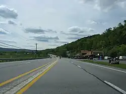 At this point, the road heads east as a four-lane divided highway with the Loyalhanna Creek parallel to the south, passing to the north of the Idlewild and Soak Zone amusement park. The median widens again and the route intersects the southern terminus of PA 259 in Millbank. US 30 curves south and turns to the east. The road curves southeast and the median narrows, at which point it heads along the southwest border of Ligonier as a four-lane divided highway. The route crosses PA 711 and passes to the south of Fort Ligonier. US 30 leaves Ligonier and narrows to a two-lane undivided road, intersecting the northern terminus of PA 381. The route passes through the Laughlintown and runs along the southern border of Laurel Mountain. Past the Laurel Mountain, the road ascends Laurel Hill and comes to a westbound runaway truck ramp. Further up the hill, the route reaches a westbound truck brake check station and briefly becomes a divided highway through a sharp turn before it comes to another westbound truck brake check station.[2][3]
