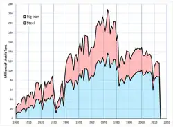 The U.S. is the third-largest producer of raw steel worldwide, after China and India, and is ranked sixth in pig iron production. In 2024, the industry produced over 79 million net tons of crude steel.[1] Approximately 25% of the steel used in the U.S. is imported.[2]