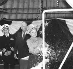 The contract to build Batfish was awarded to the Electric Boat Division of General Dynamics Corporation on 25 June 1968.[2] Her keel was laid down in its Groton, Connecticut shipyard on 9 February 1970.[3] The boat was launched on 9 October 1971, sponsored by Mrs. Mildred C. Gralla, wife of Vice Admiral Arthur R. Gralla, commander of the Military Sealift Command. The featured speaker at the ceremony was Senator Lowell P. Weicker.[4] The submarine completed her initial sea trials successfully in June 1972 under the supervision of Admiral Hyman G. Rickover.[5] She was commissioned at a ceremony in Groton on 1 September 1972 where Rear Admiral Walter L. Small was the featured speaker.[6]