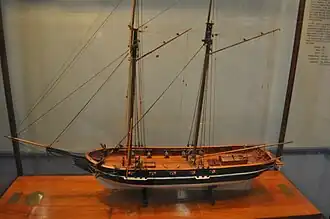 The Shark was built in the Washington Navy Yard to the designs of Henry Steers. It was designed for combating Caribbean piracy. The vessel had an "inclination to lower its bow and dive under when pressed by the wind under full sail."[1] On 11 May 1821, Matthew C. Perry was ordered to take command of Shark. She was launched on 17 May and the ship was ready to receive her crew on 2 June 1821.