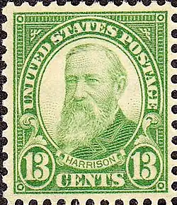 - Benjamin HarrisonThe 13-cent Harrison stamp was designed by Clair Aubrey Huston. John Eissler engraved the vignette image of Harrison, basing it on the same photograph of Harrison (one provided by Harrison's widow) that had been the source of the 1902 stamp. A late addition to the series, it was issued January 11, 1926, both in Indianapolis, Indiana, where Harrison had long resided, and Washington, D.C. This would be Harrison's second appearance on U.S. Postage.[1]