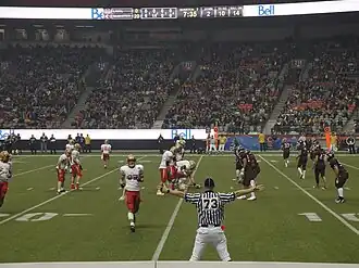 The University of Quebec at Trois-Rivières explored the possibility of adding a football program with the launch planned for the 2017 season.[10] The program would have been similar to Carleton University's in that there would be private funding from football alumni, but operated by shareholders.[11] As of April 2015, $800,000 of the required $3 million had been raised in support of the varsity sport at UQTR.[12] The capacity of the football stadium would then be increased from 2000 to 6270 seats.[11] However, the UQTR Board of Regents refused to commit to the proposal. The UQTR Patriotes previously fielded a senior varsity team from 1971 to 1973 and 1977 to 1979.[13][14]