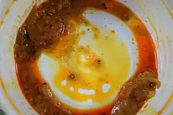 Leftovers of an Indian curry on a plate. The leftovers are called uchchhishta (noun); the plate is described as uchchhishta (adjective)