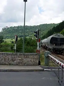 The Ulm–Sigmaringen railway runs alongside the Danube river and crosses it several times. At Ehingen (Donau), the line leaves what is known as the Danube valley today, and follows the valley formed by the Danube in times past, along the rivers Schmiech, Ach, and Blau. The railway touches the border of the Swabian Jura (Schwäbische Alb) between Allmendingen and Blaustein, and meets its eponymous river again at the line's terminus in Ulm.