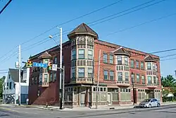 The widening of Broadway Avenue significantly improved the economic condition of the Village of Newburgh. By 1840, a carding mill, quarry, sawmill, and two taverns all clustered around what is now the intersection of Broadway and Miles Avenue.[68] A brick-making factory opened shortly after 1840, and remained in operation until the late 1850s.[69] One of the most important businesses in the Village of Newburgh opened in 1840 as well. Known as Cataract House, this three-story brick structure on the west side of Broadway Avenue consisted of a ballroom, meeting halls, and restaurant. It burned in 1852, and was rebuilt as a brick structure.[70][71] Eagle House, constructed a few years later across the street on the east side of Broadway, offered similar amenities until 1853.[72]