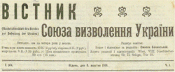 The Union for the Liberation of Ukraine (Ukrainian: Союз визволення України, СВУ; Soiuz vyzvolennia Ukrainy, SVU) was a political organization that was established on 4 August 1914 in Lemberg, Kingdom of Galicia and Lodomeria.[1] The organization was established by Ukrainian emigrants from the Russia-held Dnieper Ukraine and who were socialist by their political views representing such political parties like Revolutionary Ukrainian Party (RUP), Ukrainian Social Democratic Workers Party (USDRP), "Spilka" Socialist-Democratic ("Fellowship").[1] The organization was headed by its presidium that consisted of Andriy Zhuk, Volodymyr Doroshenko, Oleksandr Skoropys-Yoltukhovskyi, and Markian Melenevskyi.[1]