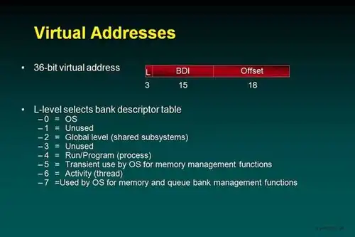 A virtual address consists of three parts. The high-order 3 bits define the sharing level. This is the heart of the entire addressing and protection scheme. Every thread has eight Bank Descriptor Tables (Segment Descriptor Tables in the industry) based on B16-B23. The tables are indexed by level – level 0 refers to the Bank Descriptor Table (BDT) based on B16, level 2 the BDT based on B18, etc. The level 0 and level 2 BDTs are common to all threads in the system. Every run (process) has its own level 4 BDT, and that BDT is common to all threads in the run. Every user thread has its own unshared level 6 BDT.