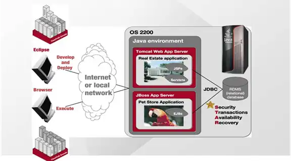 Java on OS 2200 has evolved from an interesting additional capability for small servlets and tools to a full environment capable of handling large applications. The Virtual Machine for the Java Platform on ClearPath OS 2200 JProcessor is a Linux port of the Oracle Corporation Java release. The environment includes a full J2EE application server environment using the Tomcat open source web server from the Apache Software Foundation and the JBoss application server.[13] All of this has been integrated with the OS 2200 security, databases, and recovery environment.