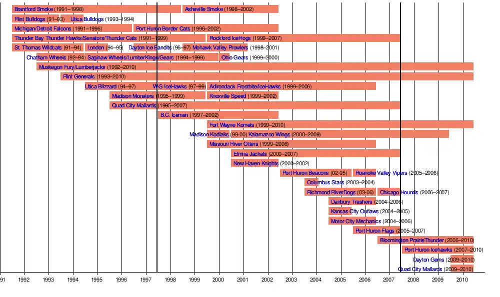 Quad City MallardsDayton Gems (2009–)Port Huron IcehawksBloomington PrairieThunderPort Huron Flags (UHL)Motor City MechanicsKansas City OutlawsDanbury TrashersChicago Hounds (ice hockey team)Richmond RiverDogsColumbus StarsRoanoke Valley VipersPort Huron BeaconsNew Haven KnightsElmira JackalsMissouri River OttersKalamazoo WingsMadison KodiaksFort Wayne KometsB.C. IcemenQuad City Mallards (1995-2007)Knoxville SpeedMadison MonstersAdirondack FrostbiteWinston-Salem IceHawksUtica BlizzardFlint GeneralsMuskegon Lumberjacks (2008–2010)Ohio GearsSaginaw Gears (UHL)Chatham WheelsMohawk Valley ProwlersDayton Ice BanditsLondon WildcatsSt. Thomas WildcatsRockford IceHogs (UHL)Thunder Bay Thunder CatsPort Huron Border CatsDetroit Falcons (CoHL)Utica BulldogsFlint BulldogsAsheville SmokeBrantford Smoke