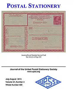 The United Postal Stationery Society (UPSS) was formed July 1, 1945 from the merger of the Postal Card Society of America, in existence since 1891, and the International Postal Stationery Society, founded 1939. Current membership stands at about 1,000. The organization's journal since 1949 is called Postal Stationery. Articles appear about new issues of U.S. and international postal stationery, plus articles on rare and unusual stationery.
