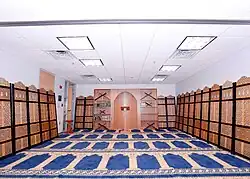 The Muslim chapel is located on the lower level. It welcomes Muslims of all denominations. The mihrab is made of wood filled with the Quran and other Muslim books. Surrounded by Middle Eastern wooden art on its walls and the floor is blue and yellow with Middle Eastern designs.[10]