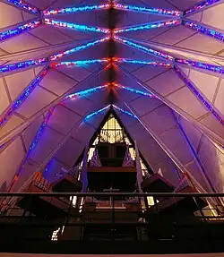 The most striking aspect of the chapel is its row of seventeen spires. The original design called for twenty-one spires, but this number was reduced due to budget issues.[4] The structure is a tubular steel frame of 100 identical tetrahedrons, each 75 feet (23 m) long, weighing five tons, and enclosed with aluminum panels. The panels were fabricated in Missouri and shipped by rail to the site. The tetrahedrons are spaced a foot apart, creating gaps in the framework that are filled with 1-inch-thick (25 mm) colored glass. The tetrahedrons comprising the spires are filled by triangular aluminum panels, while the tetrahedrons between the spires are filled with a mosaic of colored glass in aluminum frame.