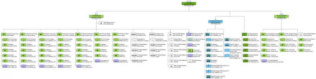 The 1st Special Forces Command (Airborne) is a division-level special operation forces command within the US Army Special Operations Command.[5] The command was established on 30 September 2014, grouping together the Army special forces, psychological operations, civil affairs, and other support troops into a single organization operating out of its new headquarters building at Fort Bragg, NC.