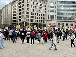 Illinois saw protests in Bloomington,[16] Chicago,[17] Peoria,[18] Rockford,[19] and Springfield.[20] On May 7, more than 1,000 abortion-rights protesters met and marched in downtown Chicago. Governor J. B. Pritzker and Lieutenant Governor Juliana Stratton spoke to the crowd in Federal Plaza.[21] On May 14, thousands of abortion rights protesters, and a group of anti-abortion activists, met and marched in Union Park and Beverly in Chicago.[22] On May 20, a majority of students at Lake Forest High School in Lake Forest walked out in protest of the leaked draft Supreme Court decision.[23][24]