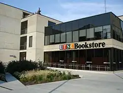 The Andrews Building, the first completed building of the campus named after its designer, John Andrews, was built in a brutalist architectural style and completed in 1964.[12] Andrews objected to the term "brutalist," since the architecture was built with human needs and logic in mind, aiming to create a connected space that limited outdoor exposure in the winter.[13] The interiors were made to mimic streets of a city, with wide hallways and balconies on upper floors. The building is divided into two wings, known as the Science Wing and the Humanities Wing. The Meeting Place, a large atrium at the center of both wings, is often used to hold events.[10] The design of the Andrews Building, along with its unique closed-circuit television teaching system, were targets of international acclaim during the decade.[14]