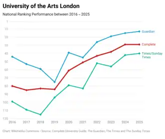 UAL received an overall ranking of 84 out of 124 in the 2019 Complete University Guide league tables, down from 48th place in 2013 and 59th in the 2012 ranking. It scored 56.5 out of 100 for graduate prospects, and 3.94 out of 5 for student satisfaction with teaching.[34] UAL was ranked 75th in the 2019 Guardian University Guide[35] and 21st out of 67 institutions in the Art subject table.[36]