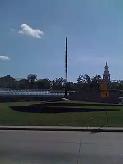 In 1979, an art selection committee was created, composed of NFTA commissioners and Buffalo area art experts, that would judge the artwork that would be displayed in and on the properties of eight stations on the Metro Rail line. Out of the 70 proposals submitted, 22 were chosen and are positioned inside and outside of the eight underground stations.[4] University station is home of three pieces of work, from Stephen Antonakos (New York City), Harvey Breverman (Buffalo), and Beverly Pepper (Todi, Italy and New York City). The work from Stephen Antonakos is called "Neon for South Campus Station" and is an "abstract form of neon tubing, creating large, incomplete circles and incomplete squares, mounted on the interior ceiling of the mezzanine level of the station." The 550 feet of tubing is red, orange and blue.[5] Harvey Breverman's work is "a large triptych on a semi-circular wall at the foot of the escalators at the trainroom level." The work is entitled Synoptic Triptych. It focuses on the composite nature of a diverse, evolving University (at Buffalo) community and its attending resources.[5] Beverly Pepper's work is a sculpture of steel and grass located in the bus loop entitled Vertical Presence-Grass Dunes. The work changes in appearance as the passengers ride around the loop. An illusion of movement is created through the passing sun patterns.[5]