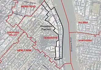 Located within the suburb of Teneriffe, Queensland, the Woolstore Precinct is the riverfront area bounded by Wyandra Street (from riverfront to no. 55 Wyandra St) and Commercial Road (including the Skyring Terrace side of Helen Street and Commercial Road) at the north, Florence Street at the west, running down along southern part of Chermside Street, including Macquarie Street and up to Hasting Street at the south. (See Precinct Map)