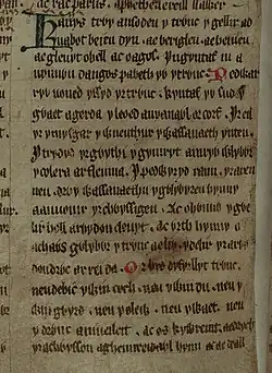 Medieval Welsh text from the Red Book of Hergest on uroscopy, called Ansoddau'r Trwnc (the 'Qualities of Urine'). Opening lines (translated):