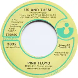 "Us and Them" was released as the second single from The Dark Side of the Moon in the United States, peaking at No. 72 on the Cash Box Top 100 Singles chart in March 1974.[3] The single peaked at No. 85 in the Canadian chart.[4]