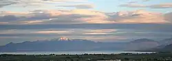 Utah Lake is within Utah Valley in north-central Utah. Mountains surround Utah Valley on three sides: the Wasatch Range to the east, Traverse Mountains to the north, and the Lake Mountains to the west. Mount Nebo reaches an altitude of 11,863-foot (3,616 m),[15] and Mount Timpanogos reaches an altitude of 11,745-foot (3,580 m),[16] nearly 7,250 feet (2,210 m) above the valley floor. Jutting into the south portion of the lake is 6,805-foot (2,074 m) West Mountain,[17] which divides Goshen Bay and Lincoln Beach. Utah Lake is situated on the western edge of the valley and covers more than 25% of Utah Valley's floor.[4] Because of its location on the western side of the valley, the eastern shore has a gentle slope and the western shore rises abruptly against the Lake Mountains. Connected to the main body of the lake are two large, shallow bays: the aforementioned Goshen Bay (north Goshen Valley) to the south and Provo Bay to the east. Major cities such as Provo and Orem are located between the lake's eastern shore and the Wasatch Range.