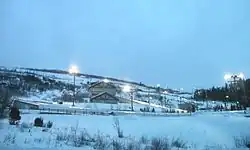 Costing about $25 million to construct, the track uses 297,000 watts of track lighting, 62 water hydrants (for ice- and snowmaking), 24 cameras, eight scoreboards, and 49 timing points.[6] Generally open from October to the end of March annually, the track takes a total of 18 days to ice down to the required thickness needed to run sliding events.[6] The track has 54 miles (87 km) of piping with 110,000 pounds (50,000 kg) of ammonia refrigeration able to keep the track to −14 °F (−26 °C).[6][10] During the operating season, a nine-man crew smooths the track daily.[10] A total of 59 temperature probes are located throughout the track to ensure the ice temperature is properly monitored.[6] Throughout the track, a $1 million retractable shading system protects the course from sun and snow, which reduces energy usage by 25 percent and the need to clear the track from snow.[6]