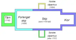 Drawing of Vår Frue kirke with dates of construction. The choir is on the right, the nave in the centre, and the tower on the left. There are two small entry porches on the top and bottom of the diagram as well.