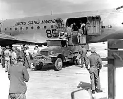 The squadron was originally formed as VJ-6M at Marine Corps Air Station Quantico, Virginia in 1922.[1] Re-designation as VMJ-1 came on 1 July 1937, and again as VMJ-152 on 7 July 1941.[3] VMJ-152 became the first Marine Corps squadron to field the new R4D-1 aircraft in the first part of 1942.[4] The squadron subsequently moved to San Diego a few months later and shipped out to the South Pacific on 10 October 1942. The unit joined Marine Aircraft Group 25 on 25 October 1942, and immediately began flying missions in support of Marines engaged in the Battle of Guadalcanal.[5]