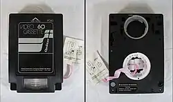 The VX cassette itself had both reels of 1⁄2-inch-wide (13 mm) magnetic tape stacked on top of each other in a coaxial fashion (much like the earlier Cartrivision and Philips VCR formats) in the bottom half of the tape, with a circular opening on the underside of the top half of the cassette, where the video head drum would enter. The tape in this opening was pre-formed in a loop to go around the head drum, eliminating the need for the tape to be pulled out of the cassette and threaded around the drum (as with later videocassette formats such as VHS and Betamax). The opening was protected by a cylindrical plastic plug to protect the tape, which was unscrewed from the opening when the tape was loaded in the machine (by means of moving a horizontal lever on the front of the machine), and inserted back into the tape when ejected (by moving the lever back).