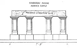 The throne slab dating from the time of Ashoka, was built when Ashoka established the first Bodh Gaya temple around the Bodhi tree circa 260 BCE.[6] The throne was initially found hidden behind a bigger throne of the Kushan period, and an even bigger one, probably from the Pala period. It is thought that the Vajrasana was initially located at the bottom of the original Bodhi tree.[6] The slab is made of polished sandstone, and dated to the time of Ashoka.[6] This is the oldest known piece of architecture at Bodh Gaya.[6]