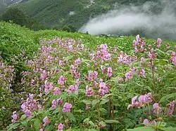 A scene from Valley of Flowers, Impatiens sulcata, This flower paints the Valley of Flowers in pink in the first week of August.
