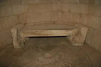 At the bottom of the burial chamber a ritual bed is adhered, which is made from small stones and plastered the same way as the walls. Each of the lateral walls has a stone bench. The access to the central room is through an inward opening two-winged lacunar stone door.