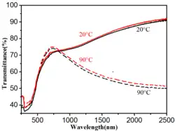 Undoped and tungsten-doped vanadium dioxide films can act as "spectrally-selective" coatings to block infrared transmission and reduce the loss of building interior heat through windows.[33][34][35] Varying the amount of tungsten allows regulating the phase transition temperature at a rate of 20 °C (20 K) per 1 atomic percent of tungsten.[33] The coating has a slight yellow-green color.[36] The performance of energy-saving smart windows can be enhanced by combining VO2 with antireflection layers.[37] The technology of low-temperature preparation of V1−xWxO2-based multilayers has been scaled up to industrial dimensions.[38]