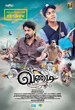 Vandi (transl. Vehicle) is a 2018 Tamil-language action thriller film directed by Rajeesh Bala. The film stars Vidharth, Chandini Tamilarasan and John Vijay.[2] Produced by Rooby Films, its music was composed by Sooraj Kurup. It was released worldwide on 23 November 2018.[3][4] The film revolves around three friends who get into trouble over a missing motorcycle and a stolen motorcycle.[5]