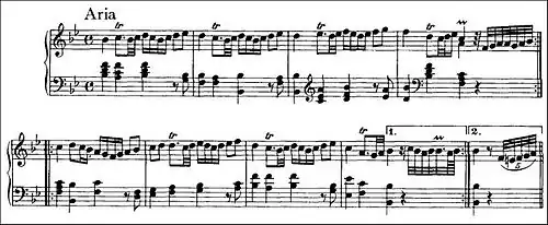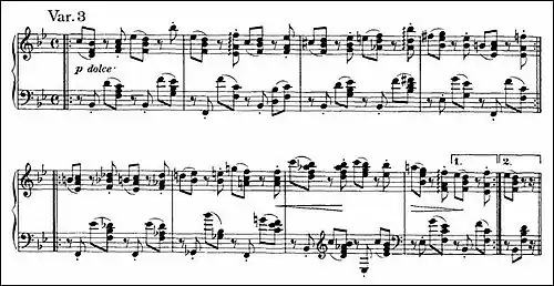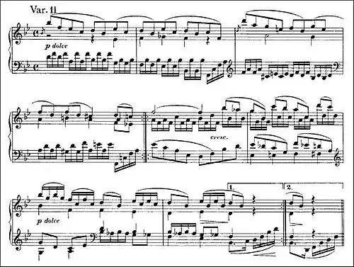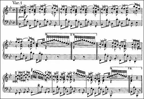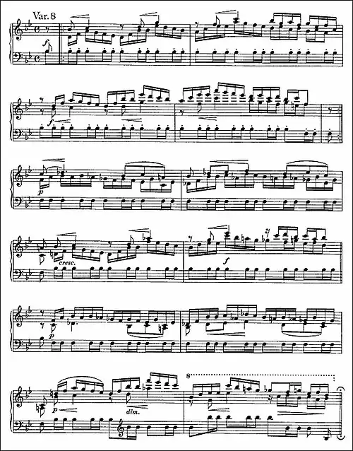 time with "a ceremonial character typical of its period".[12] The harmonic progressions are elementary. Every bar except one has one or two decorations. The melody consists of a one-bar figure in the right hand consisting mostly of a trill and a turn; it is repeated in a rising sequence three times followed by a fourth descending repetition; a decorative flourish finishes the first half of the variation, which is then repeated. The left hand plays solid chords in support throughout, three quarter-note chords to each bar setting the pace followed by a rhythmic eighth-note chord leading to the next bar and emphasizing its first beat. The second half follows a similar pattern, varied mainly by alterations to the turns.
