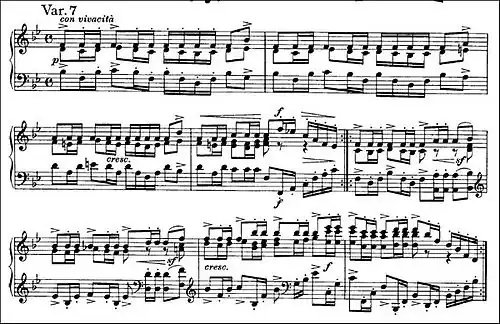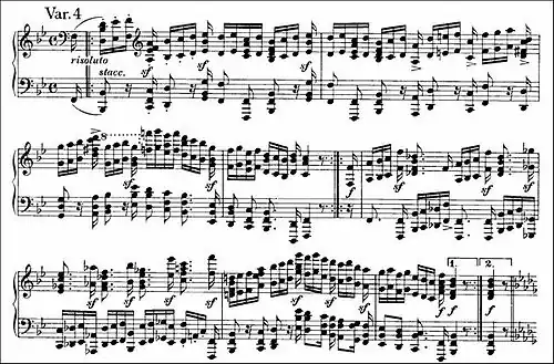 The fourth variation, marked risoluto, is a showpiece, with sixteenth notes played in octaves in both hands, strong accents (the sforzandos are frequently emphasized by six-note chords) and climaxes that rise a full octave higher than Handel's theme. The charging, syncopated rhythm places the stress on the last sixteenth note of almost every beat. Although no tempo indications are given, this variation is often performed at great speed.
