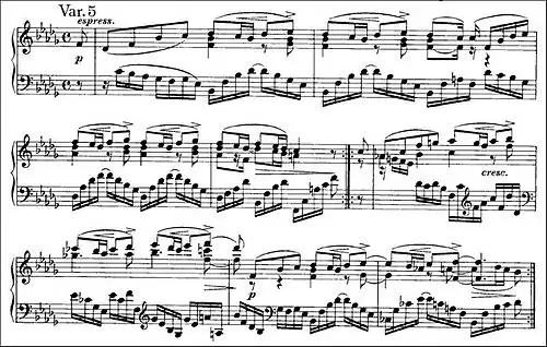 After the mighty sounds of the previous variation, the lyrical fifth variation begins quietly. The change of mood is emphasized by a shift to the tonic minor (B minor). This is the first variation in a key different from Handel's. Numerous small crescendos and decrescendos underscore the espressivo marking. The melody moves upward at a measured pace in eighth notes while the left hand accompanies with broken chords in sixteenth notes in contrary motion. The mood is peaceful and tranquil. A pairing between this variation and the following one is created by the use of the tonic minor key signature and contrary motion.