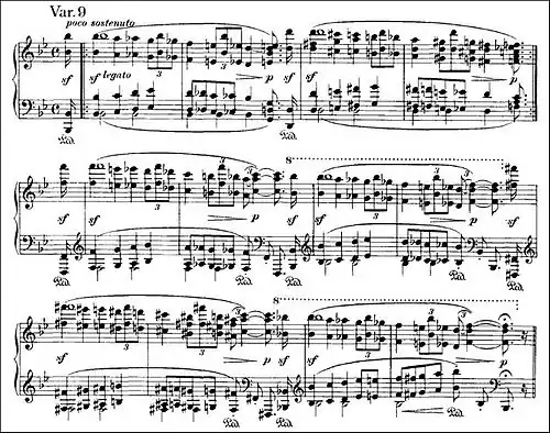 Variation 9 slows the pace of the series, with a sense of grandeur as both treble and bass move in stately, ominous octaves. The piece is highly chromatic, and, like several earlier variations, treble and bass are in contrary motion throughout. Each two-bar phrase begins with two exclamatory sf chords, as if sounding an alarm. The variation starts an octave higher than Handel's theme, and its repeated two-bar pattern continually ascends, increasing in tension, until the climax, when it reaches a full two octaves higher than Handel.