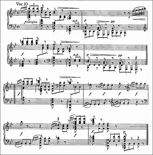 In contrast to the preceding number, Variation 10 is Allegro energico, fast and exhilarating. Its rather odd effect sounds almost devoid of melody, as the main notes of the theme are scattered among various registers. The first half consists of a series of startling gestures that begin with large, loud chords (f energetico) in the higher registers followed by echoes progressively lower, ending deep in the bass in a series of single notes played pp. The second half rushes to a great climax.