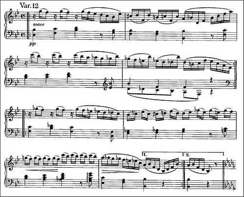 The quietness and delicacy of Variation 12 prepares for the return of the dark tonic minor in Variation 13. The left hand is similar to Variation 17, in the same rhythm as the left hand of Handel's theme.