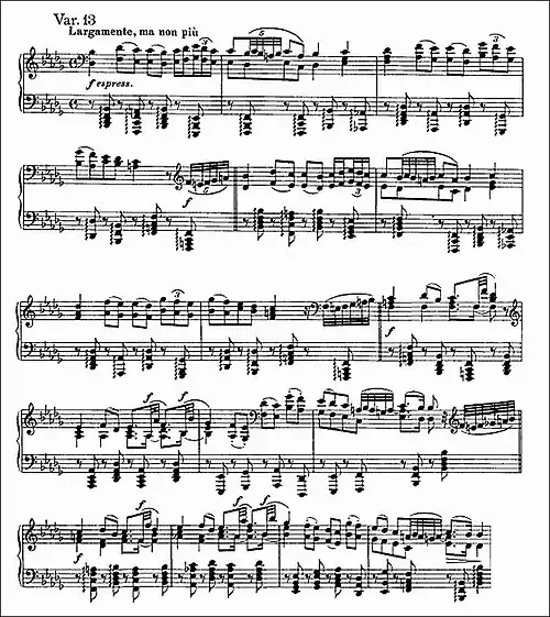 Variation 13 returns to the tonic minor in a funereal mood. It is the middle variation of the set and, in the view of Denis Matthews, the emotional centre. Right-hand sixths play against rolled chords in the left, perhaps suggesting muffled drums.[18] For Tovey the lugubrious tone suggests a "kind of Hungarian funeral march", while Malcolm MacDonald sees it as "florid" and "a Hungarian fantasia".[13] Here Brahms abandons the usual repeat signs because each passage that would have been repeated is instead written an octave higher.