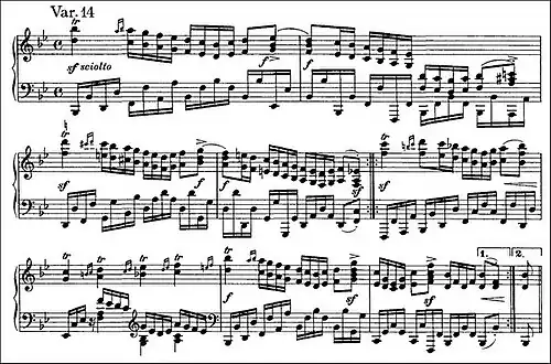 Variation 14, marked sciolto ("loose") breaks the dark mood of Variation 13 and returns to the original key. With its extended trills and scalar runs in sixths in the right hand against broken octaves in the left hand, it is a virtuoso showpiece. The mood is of great energy, excitement, and high spirits. It leads without a break into the following variation.